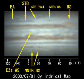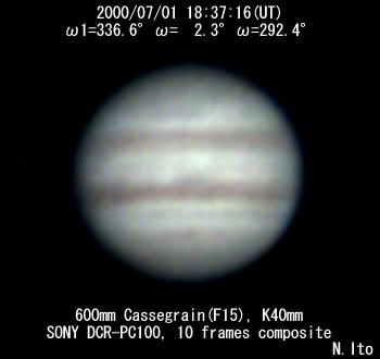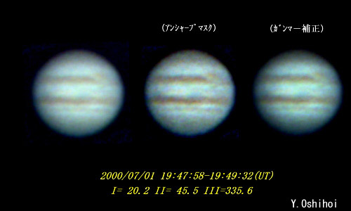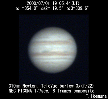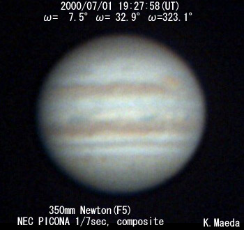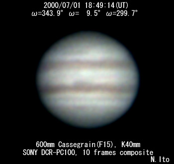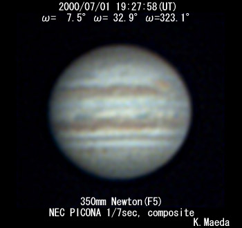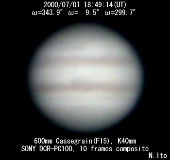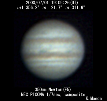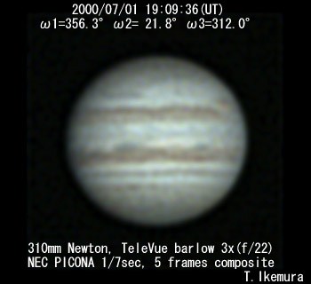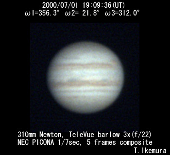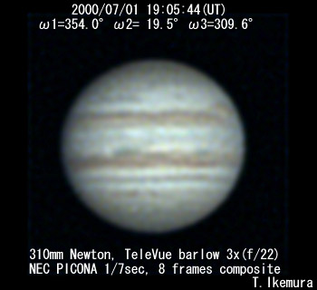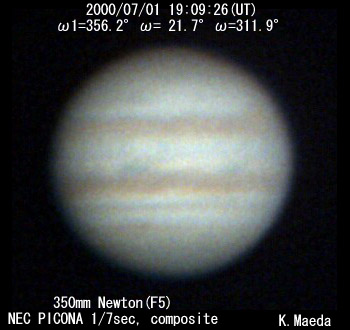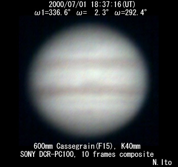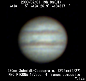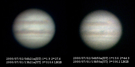 ![]() No. 1 2000/07/01 19h21m(UT) I= 1.9 II= 27.4 III=318.6 No. 2 2000/07/01 19h50m(UT) I= 19.6 II= 44.9 III=336.2
