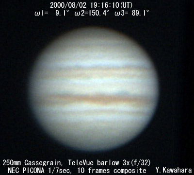 I= 9.1 II=150.4 III= 89.1 250mm Cassegrain, barlow 3x(f/32) NEC Picona 1/7sec, 10 frames composite | |