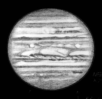 ![]() No. 29 2000/08/03 18:44:25(UT) I=147.6 II=281.4 III=220.3 350mm Newton(F5), XP8mm(f/30.5) NEC PICONA 1/7sec, 8 frames composite | ||