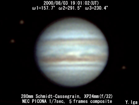 I=154.0 II=287.7 III=226.7 280mm Schmidt-Cassegrain, XP24mm(f/32) NEC Picona 1/7sec, 4 frames composite Seeing:7/10 Transp.:5/5
