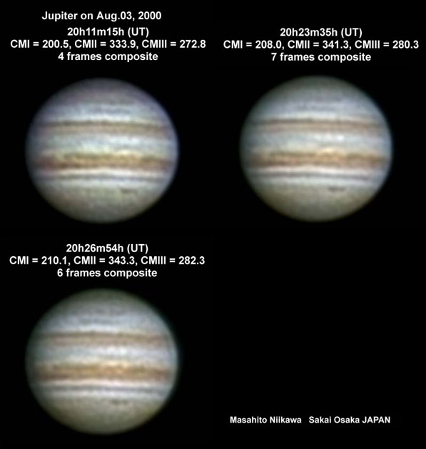 ![]() No. 8 2000/08/03 19h37m(UT) I=178.3 II=311.9 III=251.9 No. 9 2000/08/03 19h40m(UT) I=180.1 II=313.7 III=253.7 No.10 2000/08/03 20h02m(UT) I=193.5 II=327.0 III=267.0 250mm Newton, BITRAN BT-01, LRGB Seeing:7-8/10 Transp.:9/10 | ||