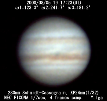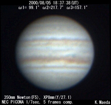 ![]() No. 28 2000/08/05 18:47:32(UT) I=105.1 II=223.7 III=163.1 De= +3.3 E.Dia=37.04" |