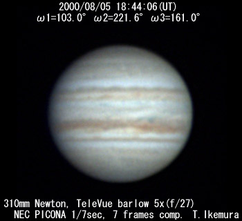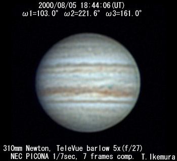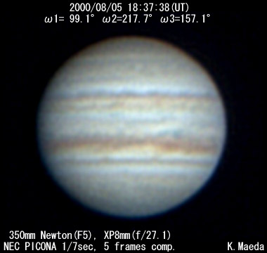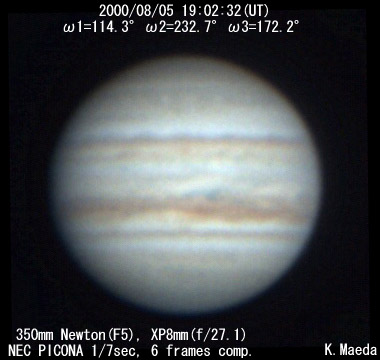 ![]() No. 27 2000/08/05 18:44:06(UT) I=103.0 II=221.6 III=161.0 De= +3.3 E.Dia=37.04" |