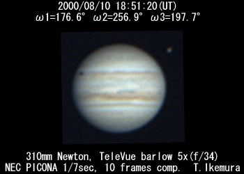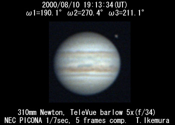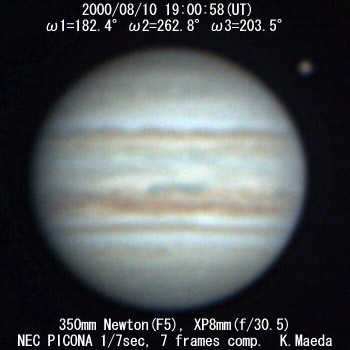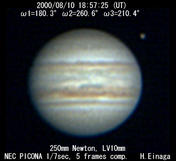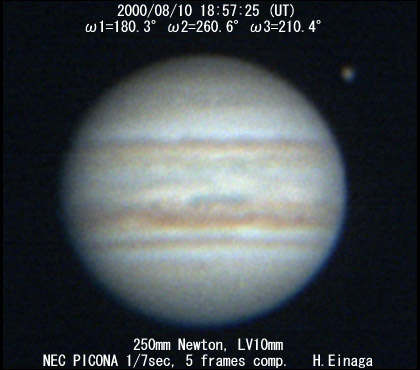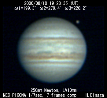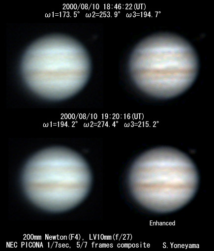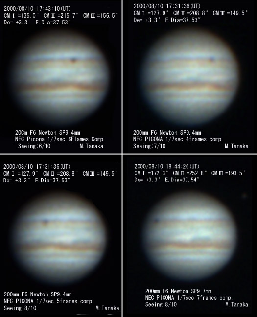 No. 2 2000/08/10 17:31:36(UT) I=127.9 II=208.8 III=149.5, 4 frame comp., Seeing:7/10 No. 3 2000/08/10 17:43:10(UT) I=135.0 II=215.7 III=156.5, 6 frame comp., Seeing:6/10 No. 4 2000/08/10 ??:??:??(UT) I=???.? II=???.? III=???.?, 5 frame comp., Seeing:8/10 No. 5 2000/08/10 18:44:26(UT) I=172.3 II=252.8 III=193.5, 7 frame comp., Seeing:8/10 200mm Newton(F6), SP9.7mm NEC Picona 1/7sec