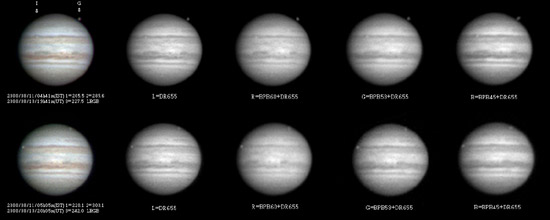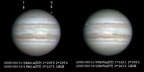 ![]() No.11 2000/08/10 19h41m(UT) I=205.5 II=285.6 III=227.5 No.12 2000/08/10 20h05m(UT) I=220.1 II=300.1 III=242.0 250mm Newton, BITRAN BT-01, LRGB Seeing:6-7/10 Transp.:8/10 | ||