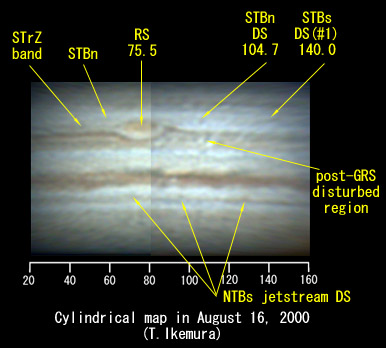 ![]() No. 18 2000/08/16 19:11:38(UT) I= 56.0 II= 90.4 III= 32.8 250mm Cassegrain, barlow 3x(f/32) NEC Picona 1/7sec, 10 frames composite | ![]()
