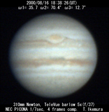 ![]() No. 35 2000/08/16 18:38:26(UT) I= 35.7 II= 70.4 III= 12.7 De= +3.3 E.Dia=38.18" | ![]() (Enhanced by Y.Iga)