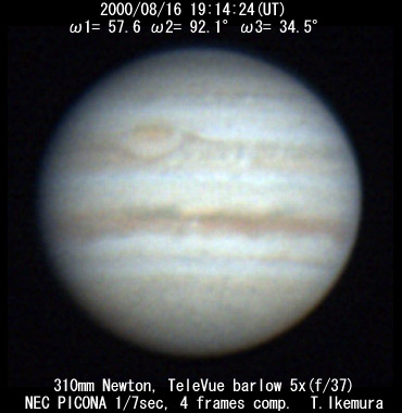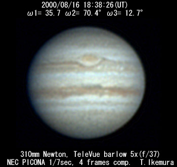 ![]() No. 37 2000/08/16 19:14:24(UT) I= 57.6 II= 92.1 III= 34.5 De= +3.3 E.Dia=38.18" | ![]() (Enhanced by Y.Iga)