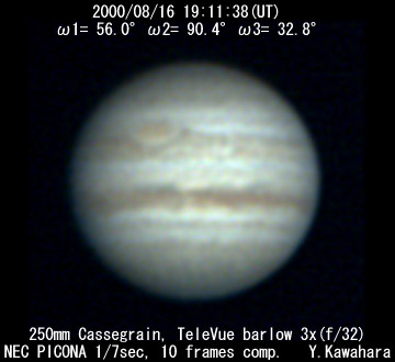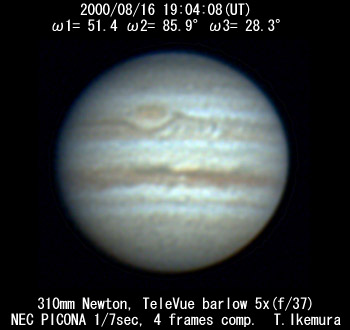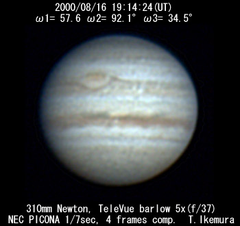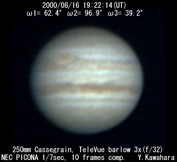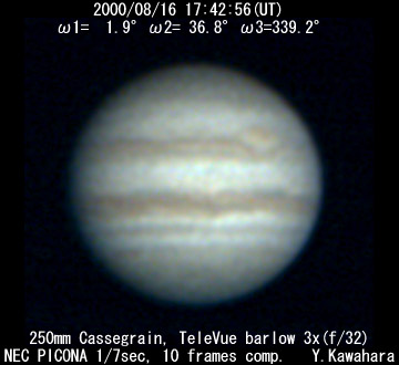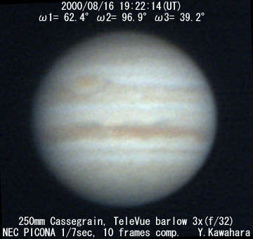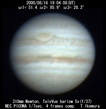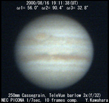 ![]() No. 17 2000/08/16 17:42:56(UT) I= 1.9 II= 36.8 III=339.2 250mm Cassegrain, barlow 3x(f/32) NEC Picona 1/7sec, 10 frames composite | ![]()