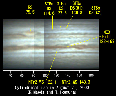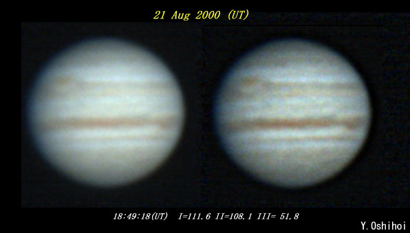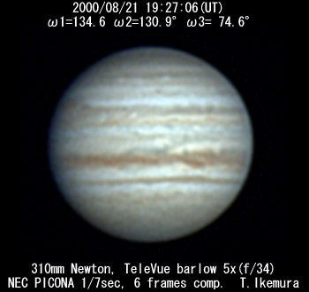 ![]() No. 38 2000/08/21 19:27:06(UT) I=134.6 II=130.9 III= 74.6 De= +3.3 E.Dia=38.18" | ![]() (Enhanced by Y.Iga)