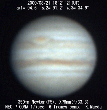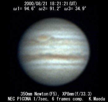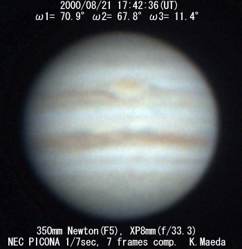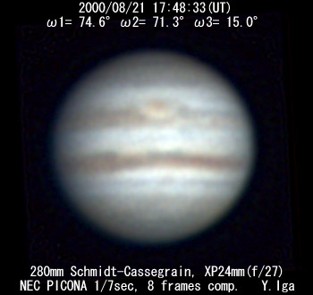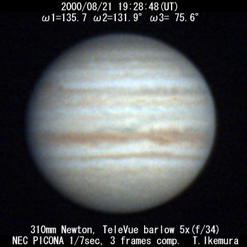 ![]() No. 23 2000/08/21 19:10:16(UT) I=124.4 II=120.7 III= 64.4 250mm Cassegrain, barlow 3x(f/32) NEC Picona 1/7sec, 10 frames composite | ![]()