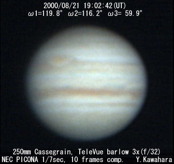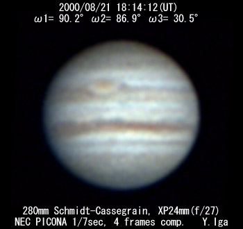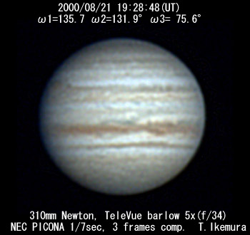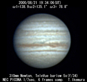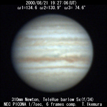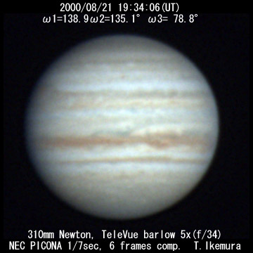 ![]() No. 22 2000/08/21 19:02:42(UT) I=119.8 II=116.2 III= 59.9 250mm Cassegrain, barlow 3x(f/32) NEC Picona 1/7sec, 10 frames composite | ![]()