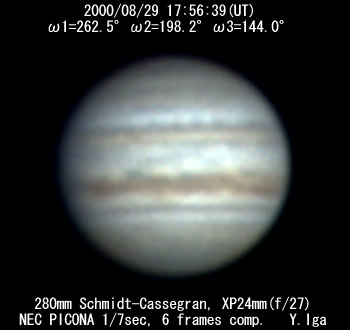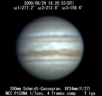 I=277.2 II=212.8 III=158.6 280mm Schmidt-Cassegrain, XP24mm(f/27) NEC Picona 1/7sec, 4 frames composite Seeing:6/10 Transp.:4/5