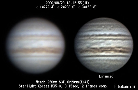 ![]() No. 9 2000/08/29 19:28:34(UT) I=160.6 II=103.5 III= 49.0 Enhanced by H.Nakanishi