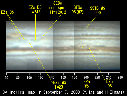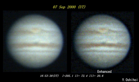 ![]() No. 7 2000/09/07 17:31:14(UT) I=228.0 II= 95.2 III= 43.4 210mm Newton, XP8mm NEC Picona 1/7sec, 10 frames composite | ![]() (Enhanced by Y.Iga)