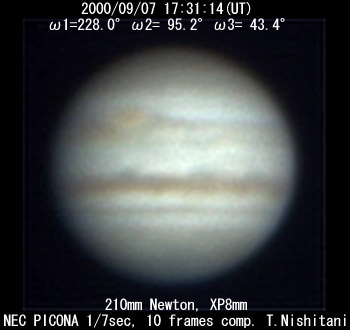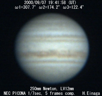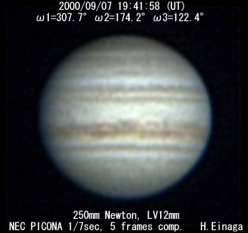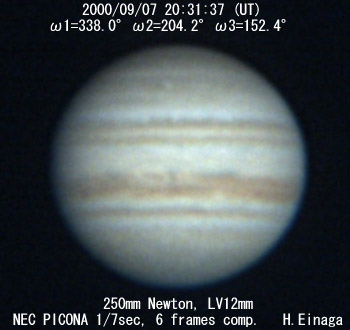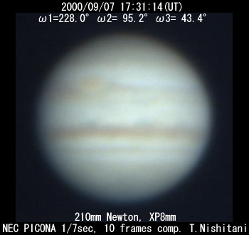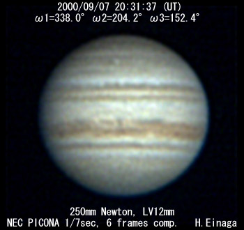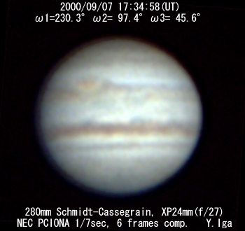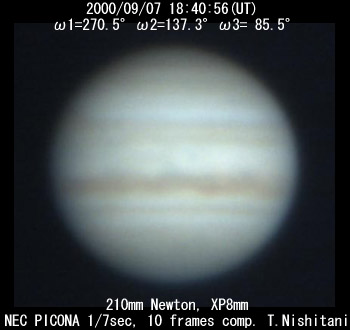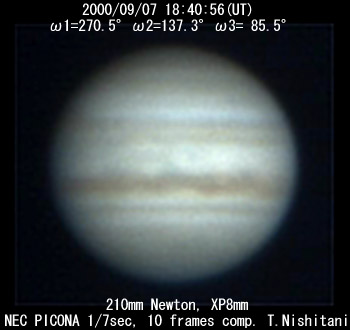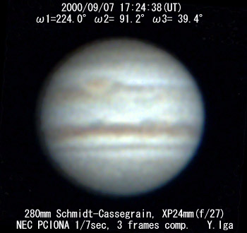 ![]() No. 8 2000/09/07 18:40:56(UT) I=270.5 II=137.3 III= 85.5 210mm Newton, XP8mm NEC Picona 1/7sec, 10 frames composite | ![]() (Enhanced by Y.Iga)