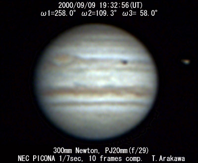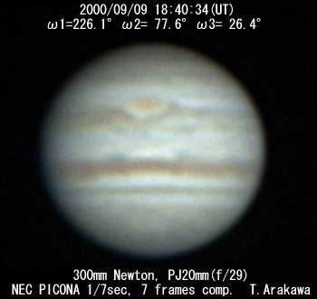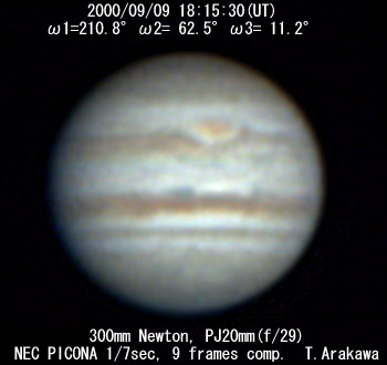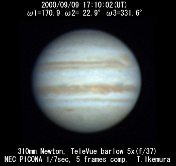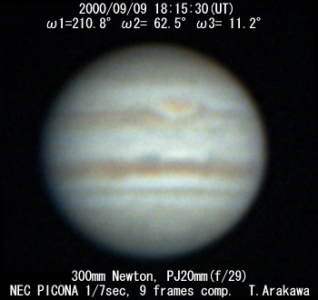 ![]() No. 5 2000/09/09 18:15:30(UT) I=210.8 II= 62.5 III= 11.2 300mm Newton, PJ20mm(f/29) NEC Picona 1/7sec, 9 frames composite | ![]() (Enhanced by Y.Iga) | |