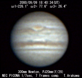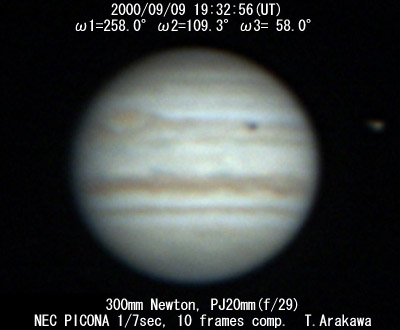 ![]() No. 9 2000/09/09 19:32:56(UT) I=258.0 II=109.3 III= 58.0 300mm Newton, PJ20mm(f/29) NEC Picona 1/7sec, 10 frames composite | ![]() (Enhanced by Y.Iga) | |