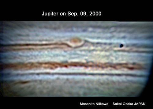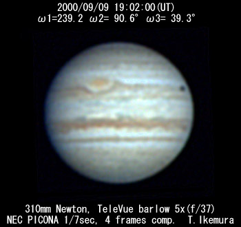 ![]() No. 10 2000/09/09 19:43:00(UT) I=264.2 II=115.4 III= 64.1 300mm Newton, PJ20mm(f/29) NEC Picona 1/7sec, 10 frames composite | ![]() (Enhanced by Y.Iga) | |