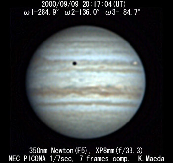 ![]() No. 8 2000/09/09 18:49:20(UT) I=231.5 II= 82.9 III= 31.7 300mm Newton, PJ20mm(f/29) NEC Picona 1/7sec, 9 frames composite | ![]() (Enhanced by Y.Iga) | |