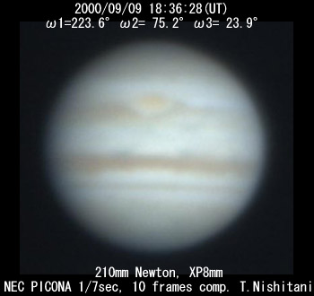 ![]() No. 10 2000/09/09 18:36:28(UT) I=223.6 II= 75.2 III= 23.9 210mm Newton, XP8mm NEC Picona 1/7sec, 10 frames composite | ![]() (Enhanced by Y.Iga)