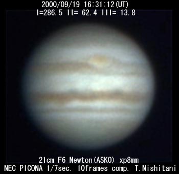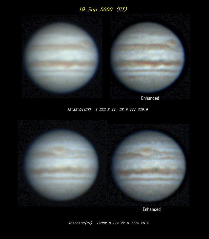 ![]() No. 15 2000/09/19 16:31:12(UT) I=286.5 II= 62.4 III= 13.8 210mm Newton, XP8mm NEC Picona 1/7sec, 10 frames composite | ![]() (Enhanced by Y.Iga)