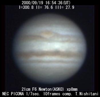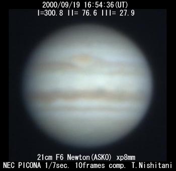 ![]() No. 16 2000/09/19 16:54:36(UT) I=300.8 II= 76.6 III= 27.9 210mm Newton, XP8mm NEC Picona 1/7sec, 10 frames composite | ![]() (Enhanced by Y.Iga)