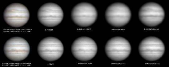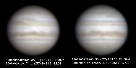 ![]() No.22 2000/09/19 17h12m(UT) I=310.0 II= 85.7 III= 38.2 No.23 2000/09/19 18h59m(UT) I= 15.3 II=150.4 III=102.9 250mm Newton, BITRAN BT-01, LRGB Seeing:5/10 Transp.:9/10 | ||