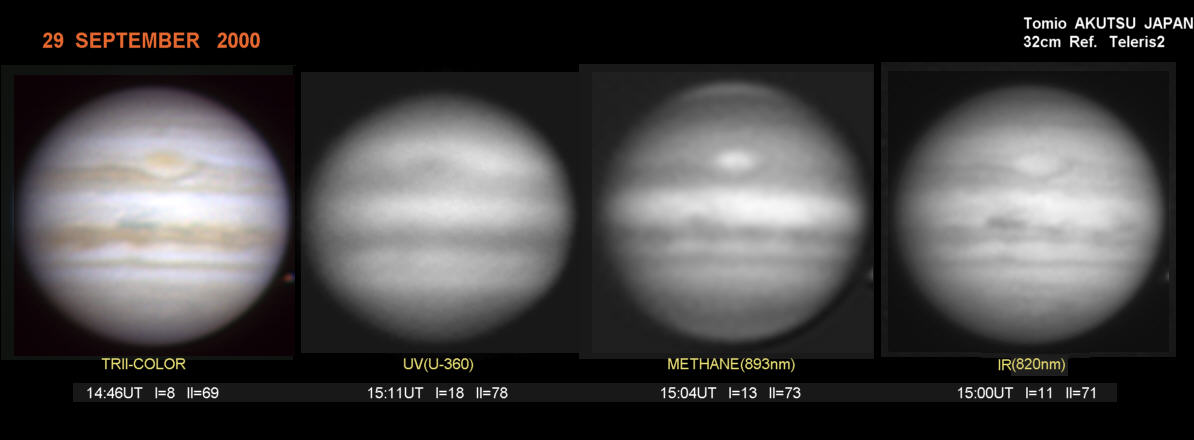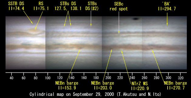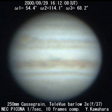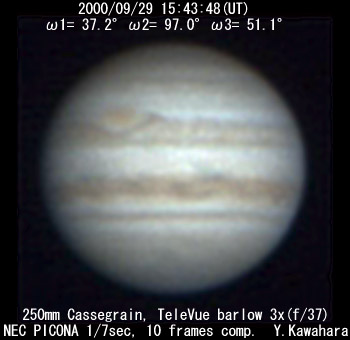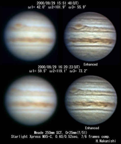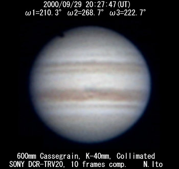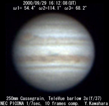 ![]() No. 45 2000/09/29 16:12:08(UT) I= 54.4 II=114.1 III= 68.2 | ![]() (Enhanced by Y.Iga) 250mm Cassegrain, barlow 3x(f/32) NEC Picona 1/7sec, 10 frames composite | |