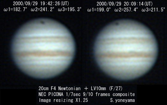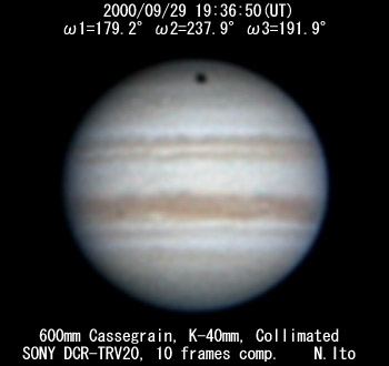 ![]() No. 44 2000/09/29 16:05:48(UT) I= 50.6 II=110.3 III= 64.4 | ![]() (Enhanced by Y.Iga) 250mm Cassegrain, barlow 3x(f/32) NEC Picona 1/7sec, 10 frames composite | |