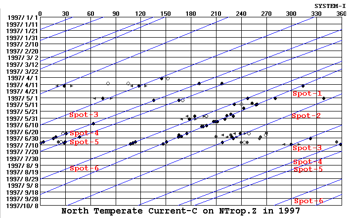 得られたNTC-Cの模様の体系Iに対するドリフト・チャートを以下に示します。黒丸(●)は暗斑を、白丸(○)は白斑を示します。また、暗部の場合は前端部・後端部をそれぞれ矢印で示します。グレーで示す模様は、今回の解析で同定されなかったものを示します。青色の直線は回帰直線を示します。