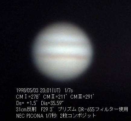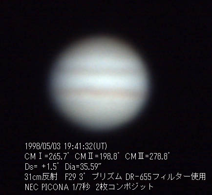 ![]() No.7 1998/05/03 19:45(UT) I=268.3 II=201.4 Seeing:2/10 Transp.:0-1/5 x311 |