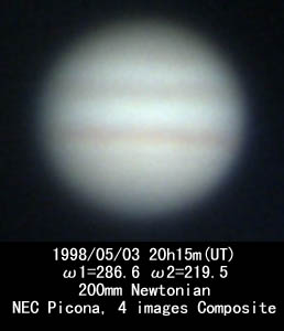 ![]() Image#6 1998/05/03 20:15(UT) I=286.6 II=219.5 Seeing:4/10 Transp.:8/10 NEC Picona 4 Images Composite |