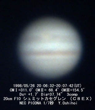 ![]() No.13 1998/05/26 19:12(UT) I=278.1 II= 35.7 Seeing:7/10 Transp.:5/5 x360 |
