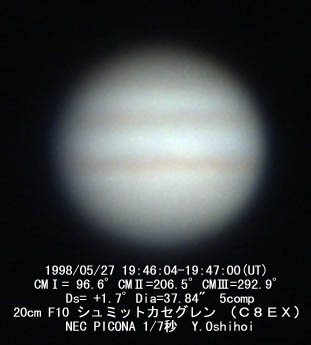 ![]() No.13 1998/05/26 19:12(UT) I= 75.6 II=185.7 Seeing:6/10 Transp.:5/5 x311 |