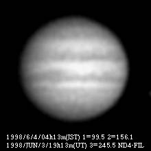 ![]() Image#18 1998/06/03 19:13(UT) I= 99.5 II=156.1 Seeing:3/10 Transp.:6/10 |