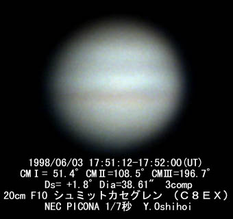 ![]() Image#17 1998/06/03 17:52(UT) I= 51.4 II=108.5 NEC Picona 1/7 sec. |
