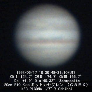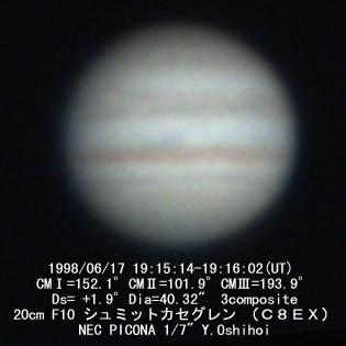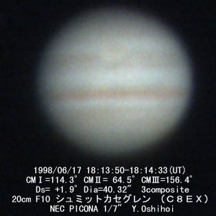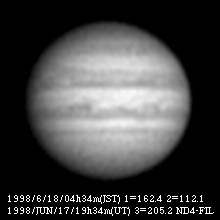 ![]() No.17 1998/06/17 18:47(UT) I=135.4 II= 85.4 Seeing:4-5/10 Transp.:3/5 x311 |