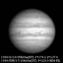 ![]() No.16 1998/06/17 18:08(UT) I=111.7 II= 61.9 Seeing:4-5/10 Transp.:2/5 x311 |
