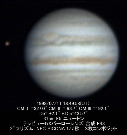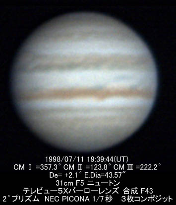 ![]() Image#32 1998/07/11 16:26(UT) I=238.6 II= 6.1 NEC Picona 1/7 sec. Tele Vue 3倍バローレンズ |