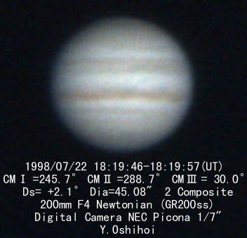 ![]() No.34 1998/07/22 17:52(UT) I=229.7 II=272.7 Seeing:3/10 Transp.:5/5 x360 |