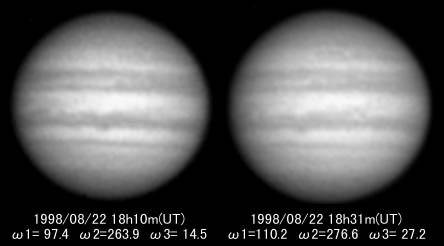 ![]() No.20 1998/08/22 16:58(UT) I= 54.9 II=221.8 Seeing:6/10 Transp.:5-4/10 |