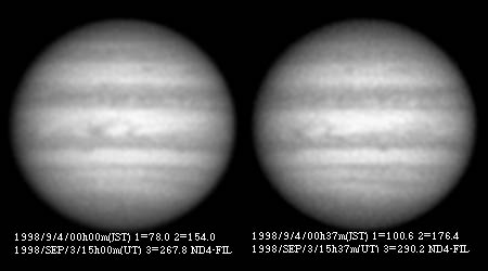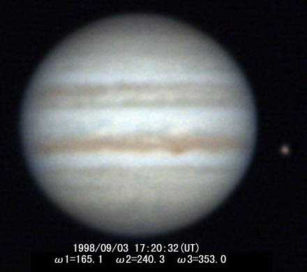 ![]() No.44 1998/09/03 12:49(UT) I=359.3 II= 76.0 Seeing:2-3/10 Transp.:4/5 LV15mm 3 images composite |