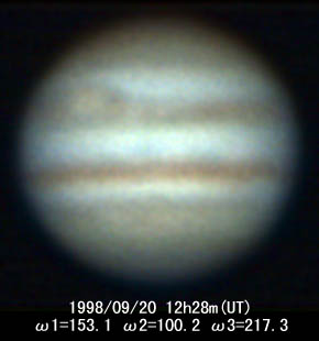 ![]() No.59 1998/09/20 12:28(UT) I=153.1 II=100.2 Seeing:3/10 Transp.:4/5 LV15mm 2 images composite |