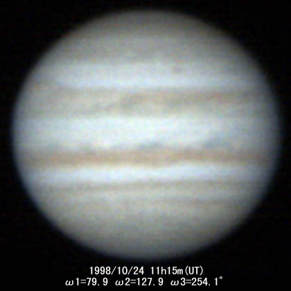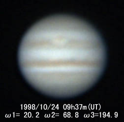 ![]() No.81 1998/10/24 15h58m(UT) ω1=252.3 ω2=298.8 Seeing:3/10 Transp.:5/5 x200 |