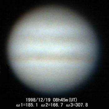 ![]() No.115 1998/12/19 10:32:52(UT) I=251.2 II=232.2 III= 13.3 De= +1.9゜E.Dia=39.53" 31cm F5 ニュートン テレビュー5Xバーローレンズ 1゜プリズム 合成 F39 NEC PICONA 1/7秒 4枚コンポジット |