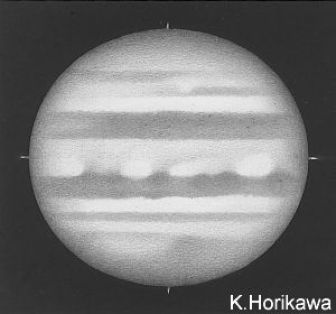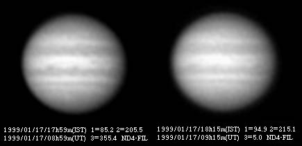 ![]() No.76 1999/01/17 09h07m(UT) I= 90.8 II=211.0 III=359.8 Seeing:2/10 Transp.:4/5 LV15mm 2 images composite |