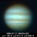 ![]() No.126 1999/01/17 10:05:30(UT) I=127.1 II=247.0 III= 35.8 De= +1.9゜E.Dia=36.50" 31cm F5 ニュートン テレビュー5Xバーローレンズ 1゜プリズム 合成 F39 NEC PICONA 1/7秒 4枚コンポジット |