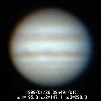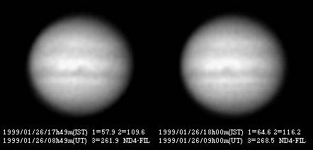 ![]() Image#119 1999/01/26 08:49(UT) I= 57.9 II=109.6 Image#120 1999/01/26 09:00(UT) I= 64.6 II=116.2 | |