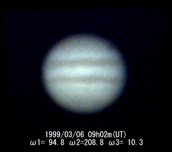 No.140 1999/03/06 09:01:42(UT) I= 94.8゜II=208.8゜III= 10.3゜ De= +2.2゜E.Dia=33.51" 31cm F5 ニュートン テレビュー3Xバーローレンズ 5゜プリズム 合成 F26 NEC PICONA 1/7秒 6枚コンポジット
